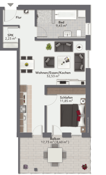 Wohnfläche: 36,73 m² inkl. Balkon
